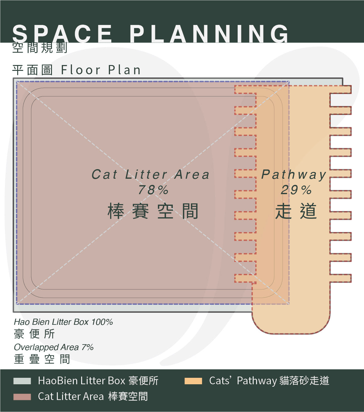 門庭寬敞挑高,高矮胖瘦都能輕鬆穿梭,低跳台入口,輕鬆衝入,不會拉在褲子上。特殊回填導板設計,讓腳上的貓砂經由落砂區重新回到砂盆裡,家長免掃地。